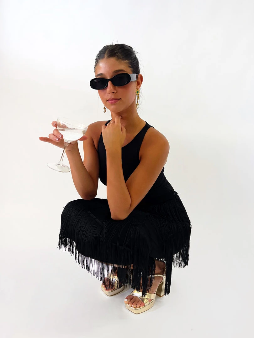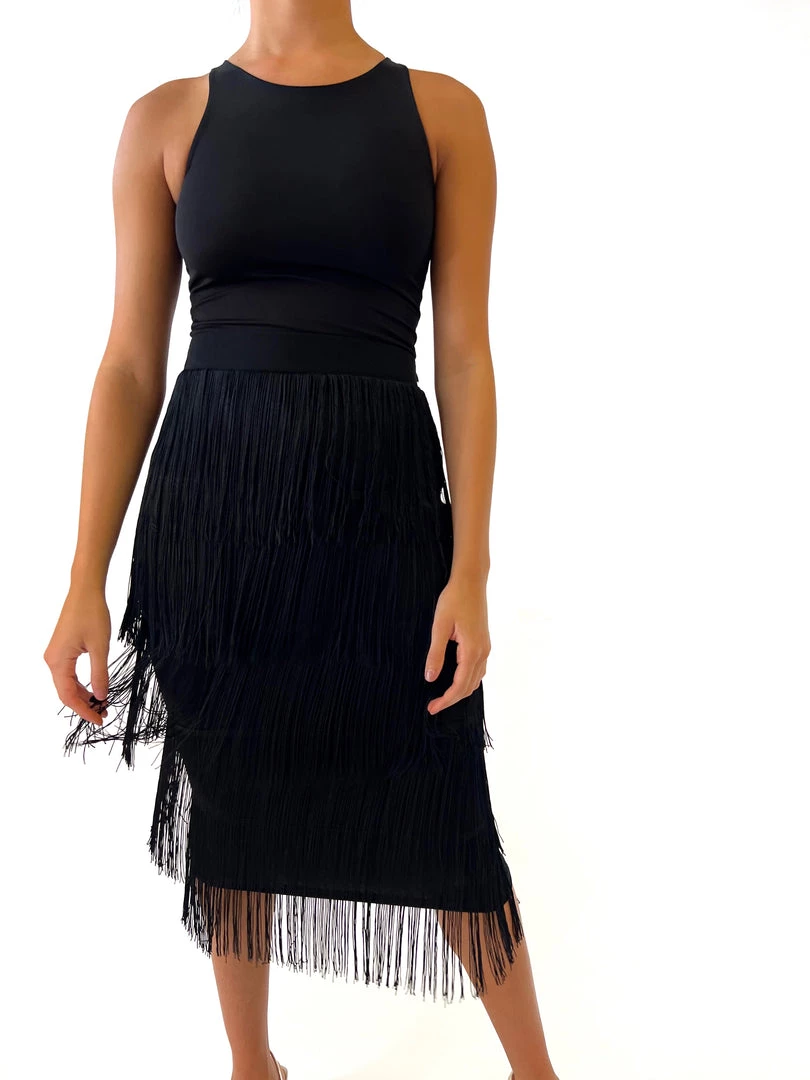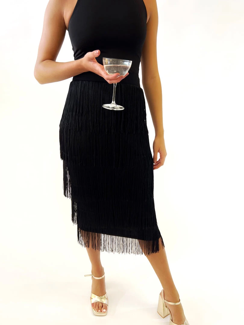 - Midi length with layered black fringe