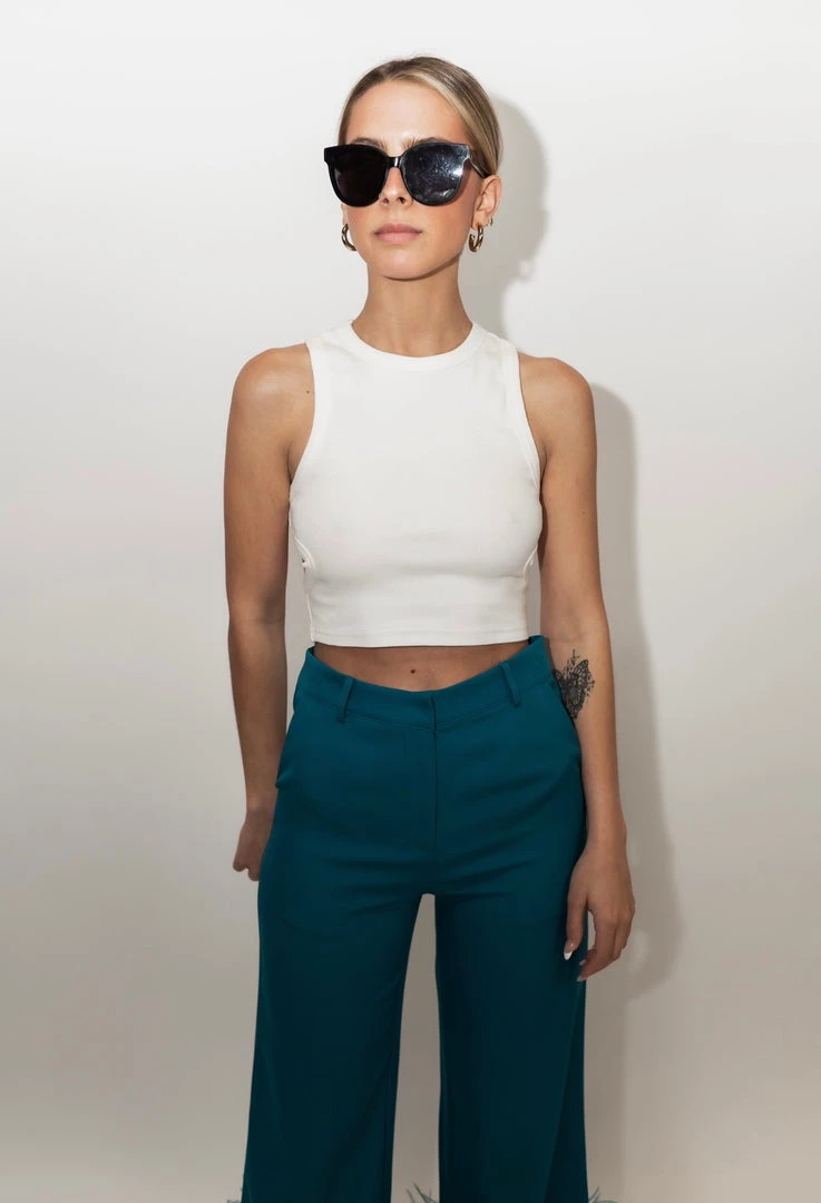- White ribbed tank with cut at detailing at side and back