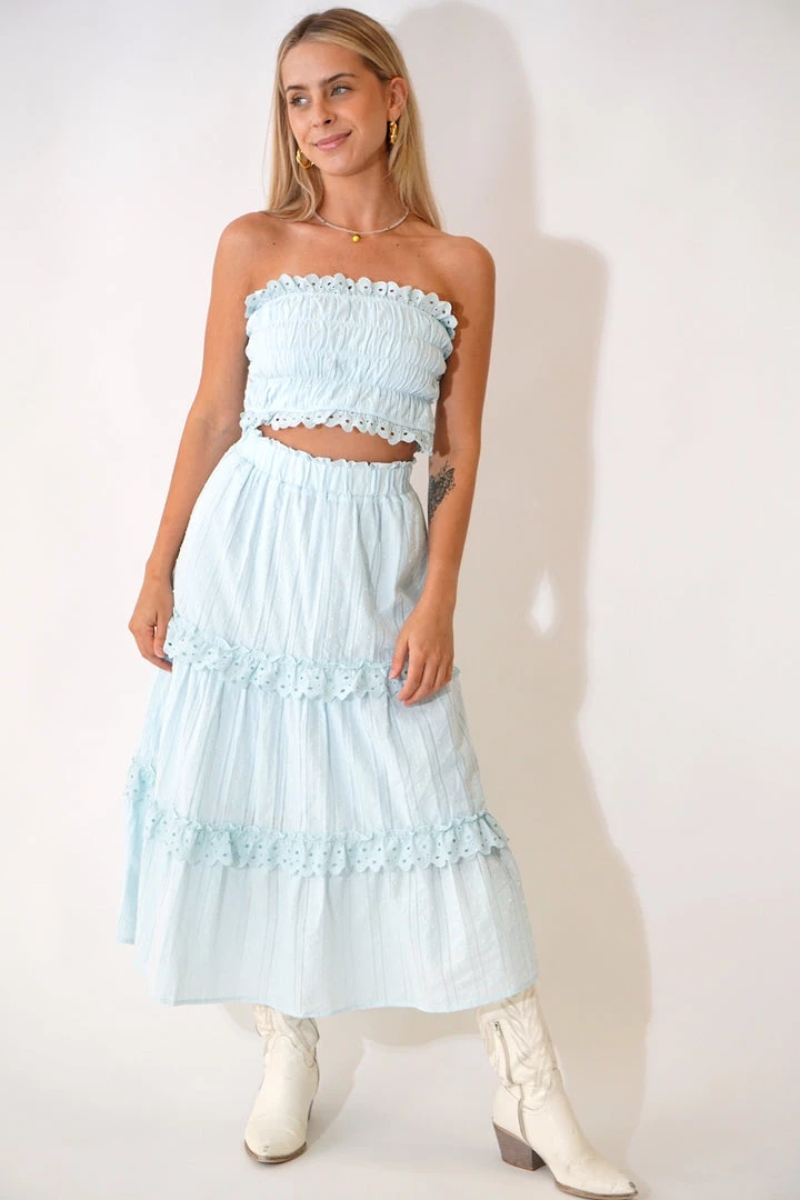 - Top has elastic and eyelet trim with Swiss dot fabric