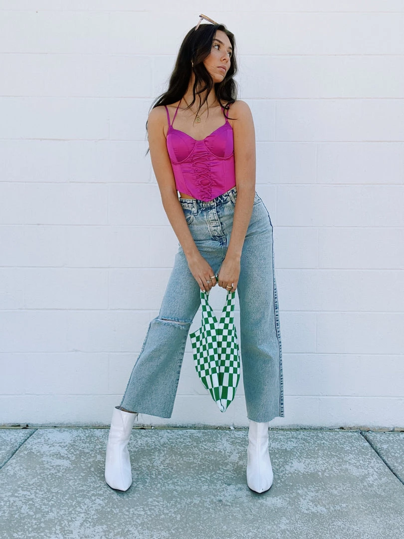 The fuchsia satin top features a cropped cut, cross loop corset detail at the front, boning detail panel throughout bodice with adjustable spaghetti straps, ties around the neck and exposed back zipper.