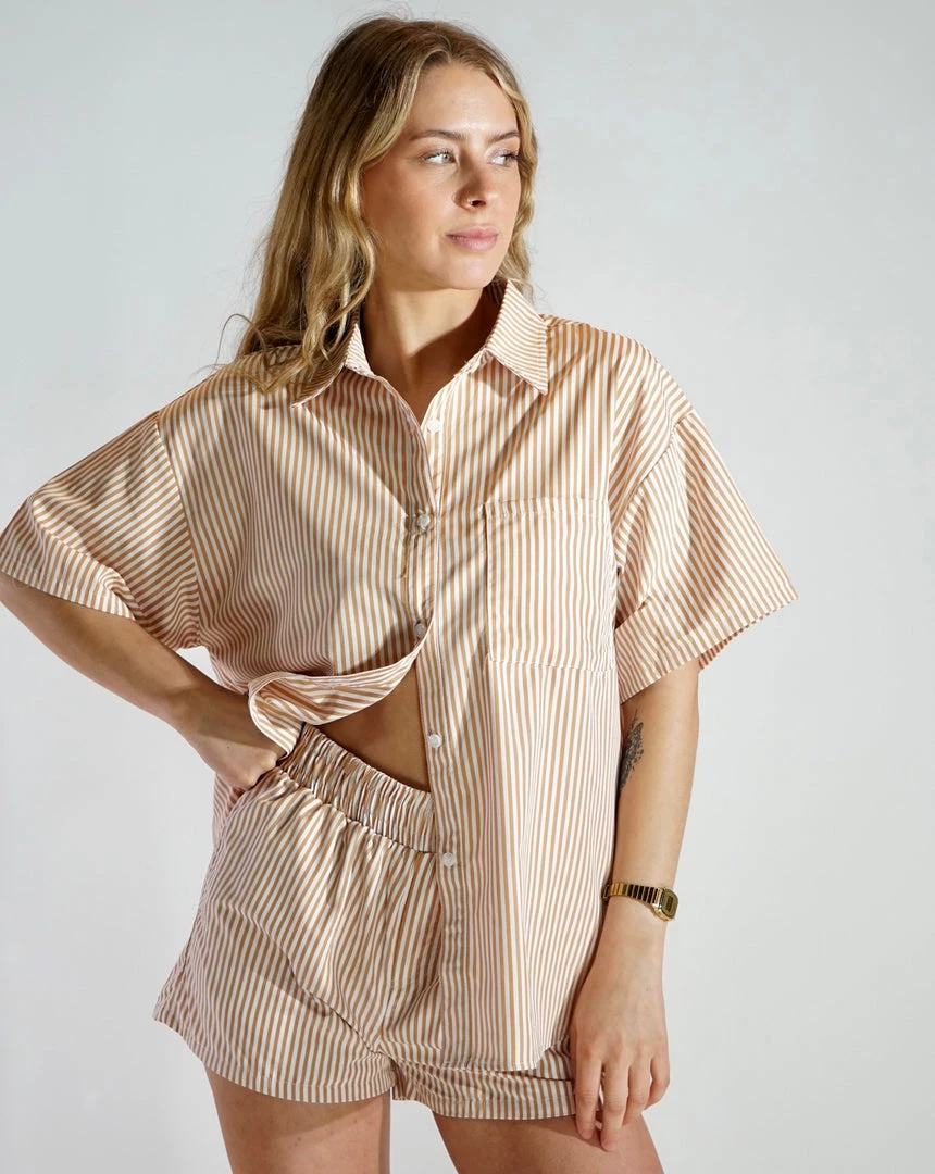 - Comes with short sleeve button down and elastic waist shorts