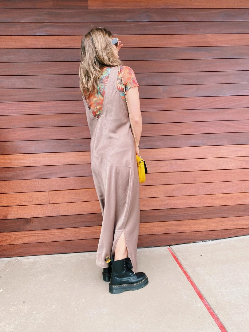 - Brown satin midi dress