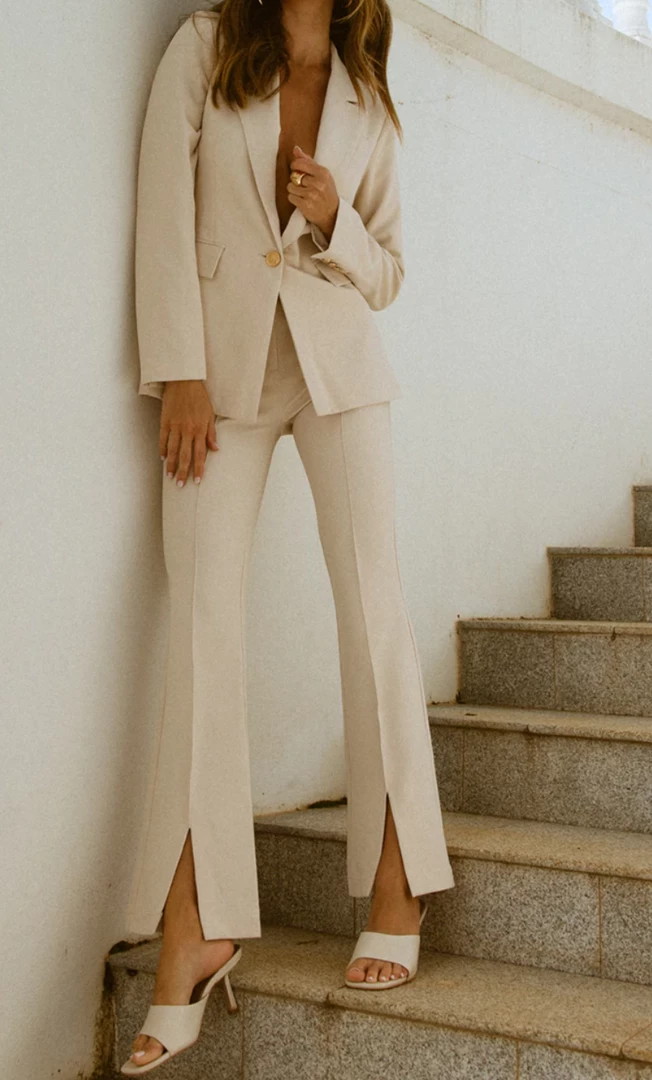 Tan split front trouser features a full-length, slightly flared pants with a split at the centre-front, pockets, a front fly with a hook bar.