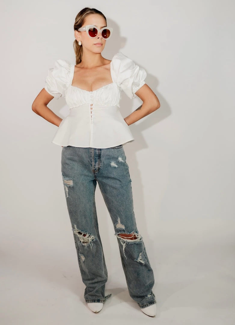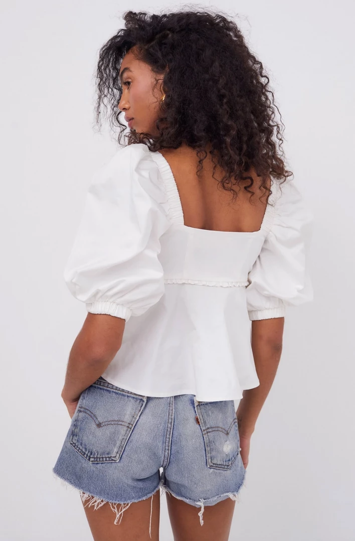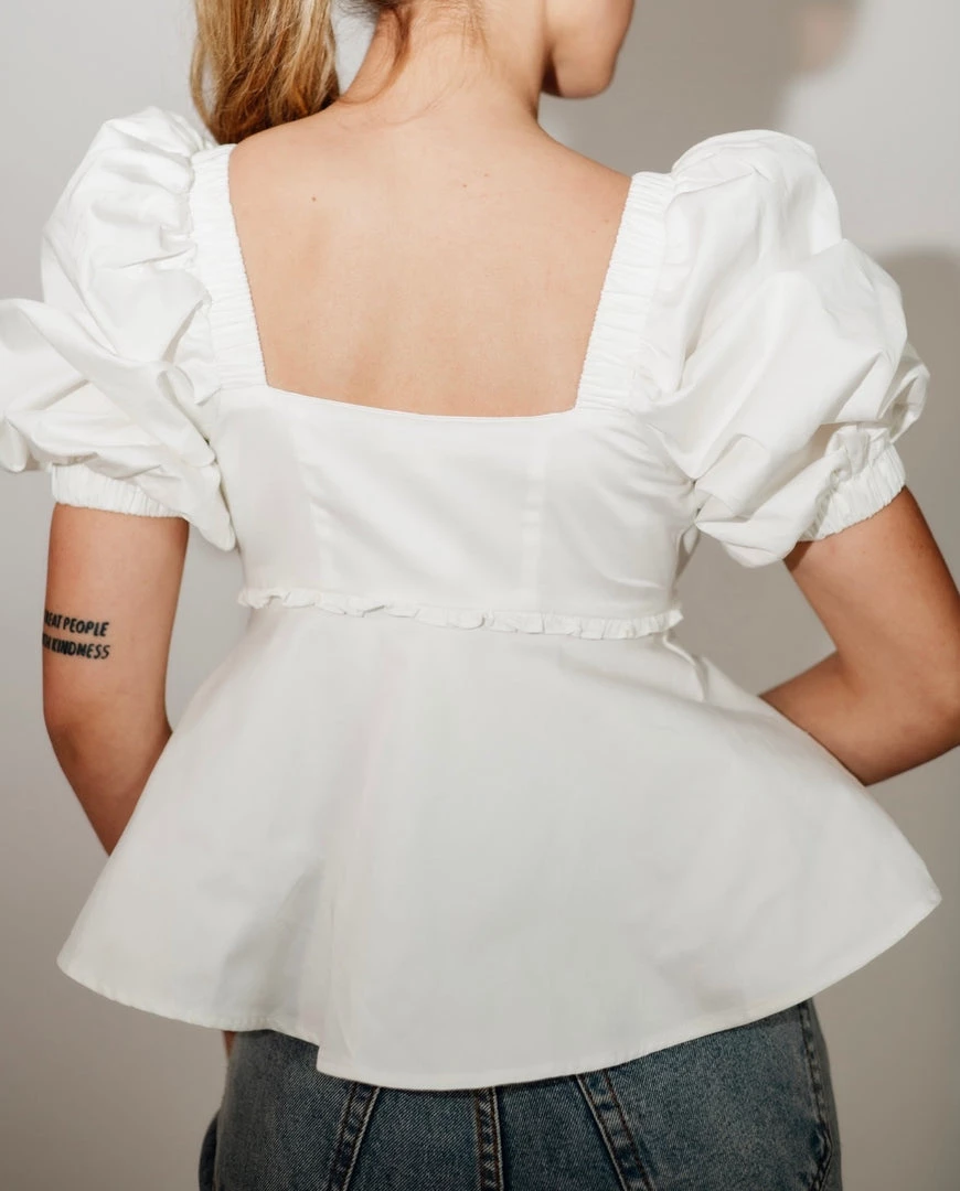 - Subtle puff sleeves with wide encased elastic along shoulder & sleeve opening
