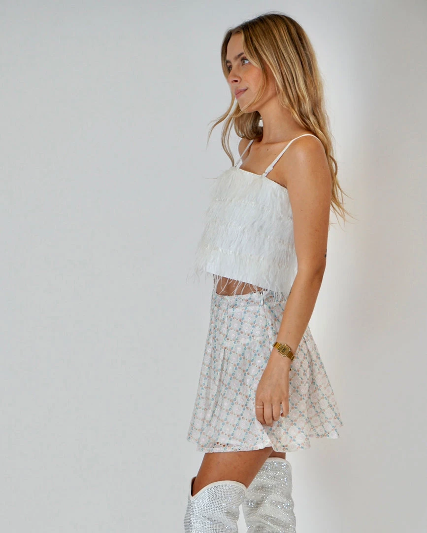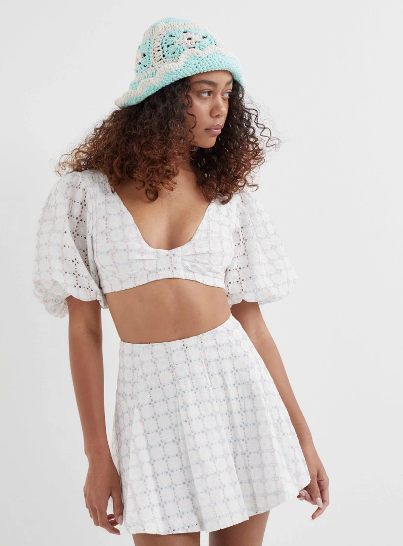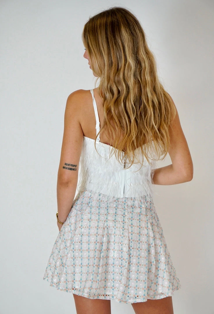 daisy eyelet embroidery mini skirt with pleats and side seam zipper