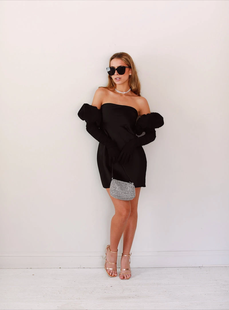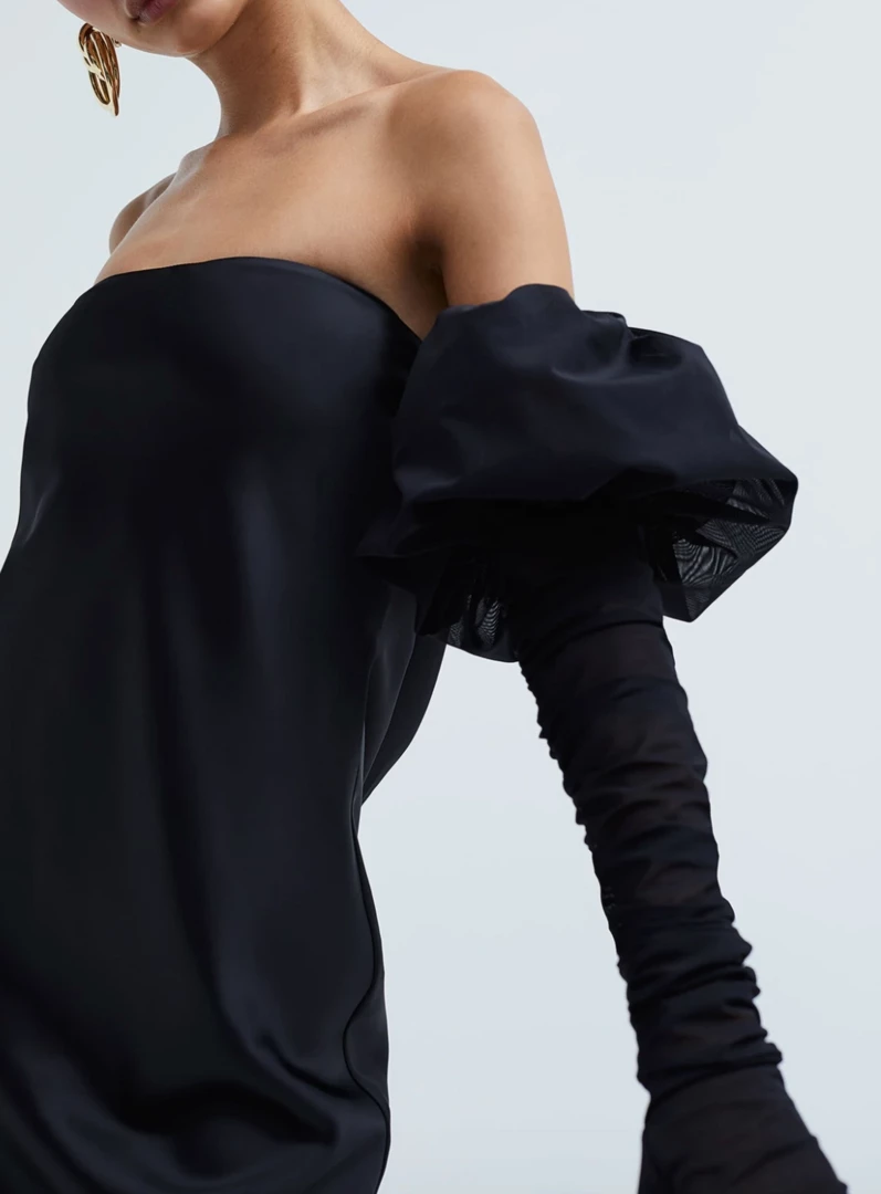 Sleek strapless satin mini dress by For Love and Lemons featuring a tied draped back. Dramatic puff glove sleeves are removable. Fully lined.