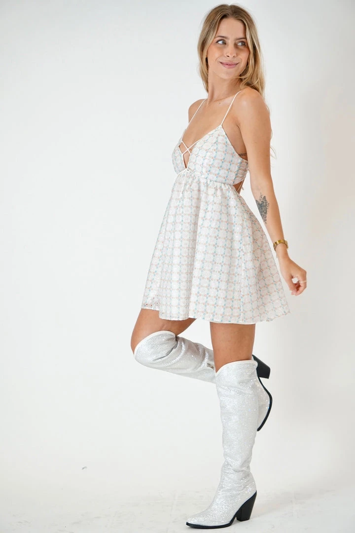 Airy mini babydoll dress featuring daisy eyelet embroidery and a plunging cutout at back. Delicate ties cross at a deep V neckline, back adjusts with a drawstring
