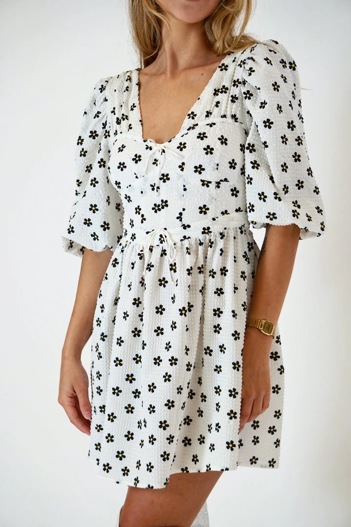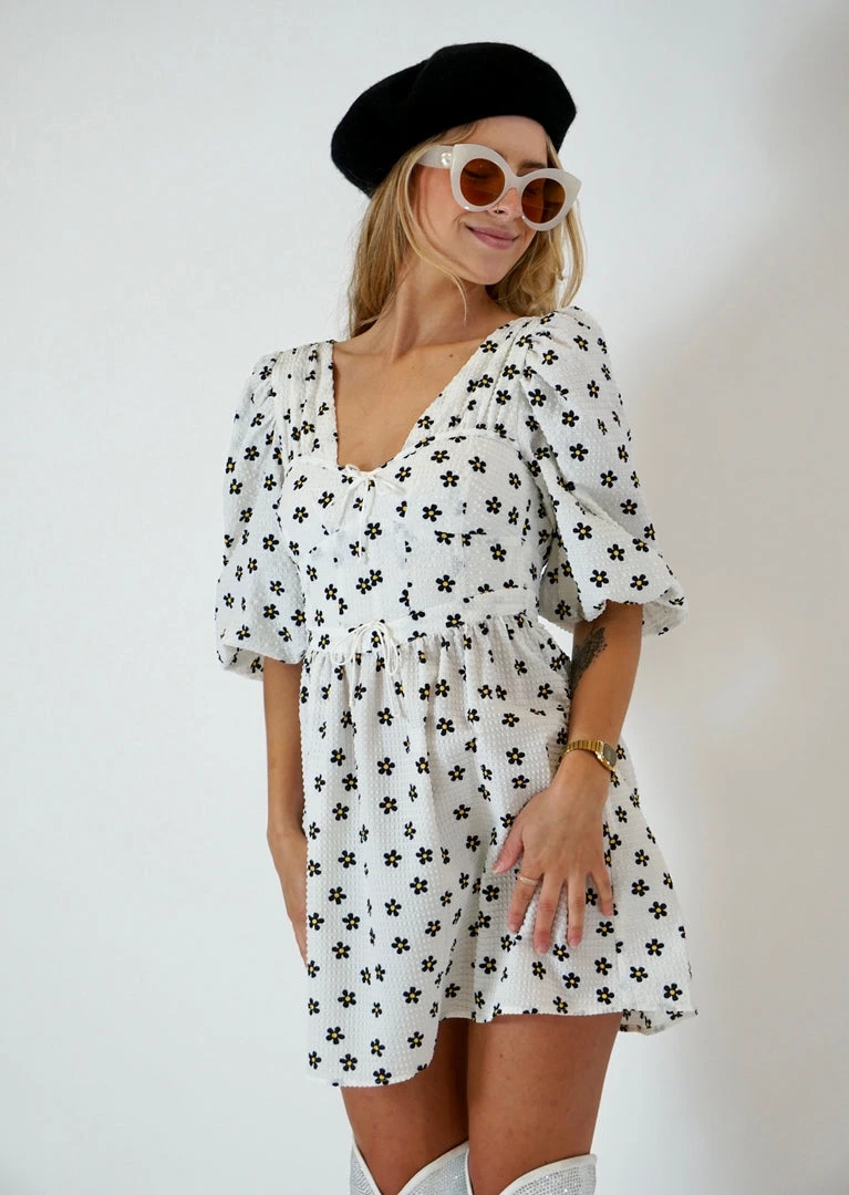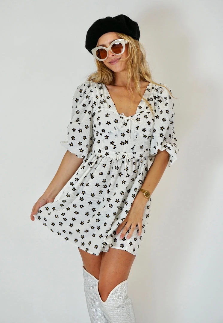 90s-inspired seersucker mini dress featuring corset-inspired style lines, pretty elbow-length puff sleeves, and an open V-back with a delicate tie closure