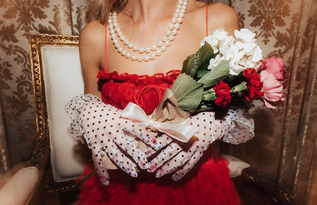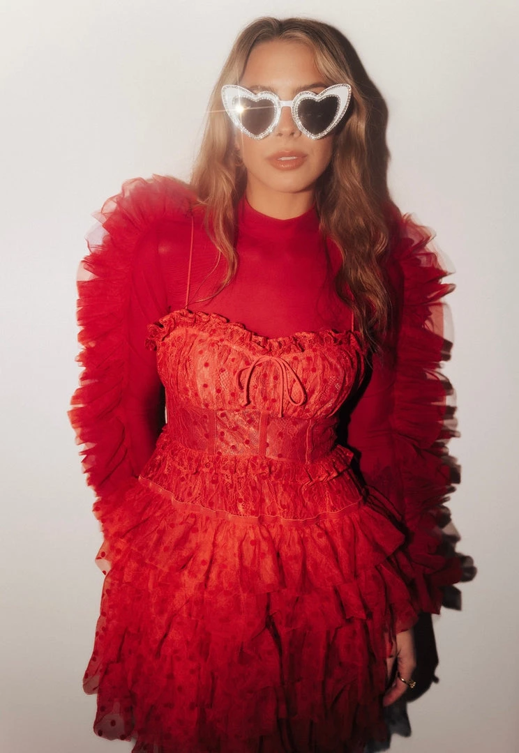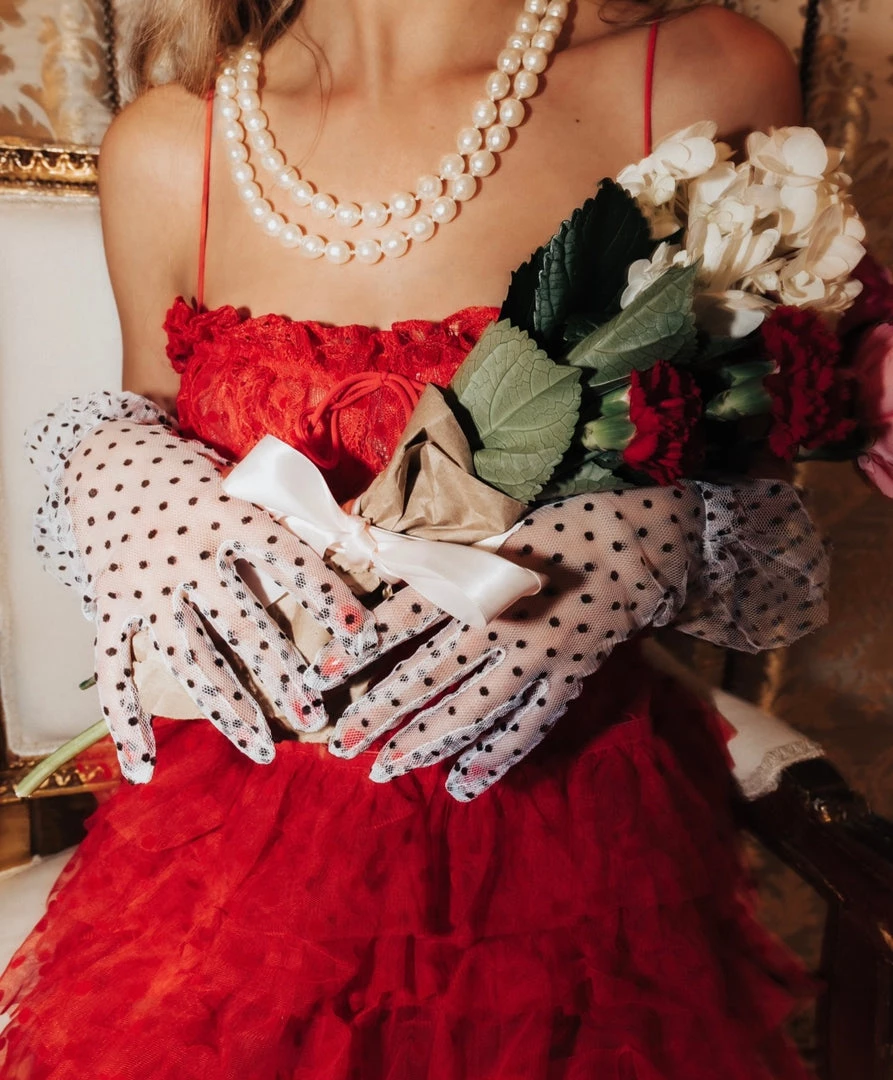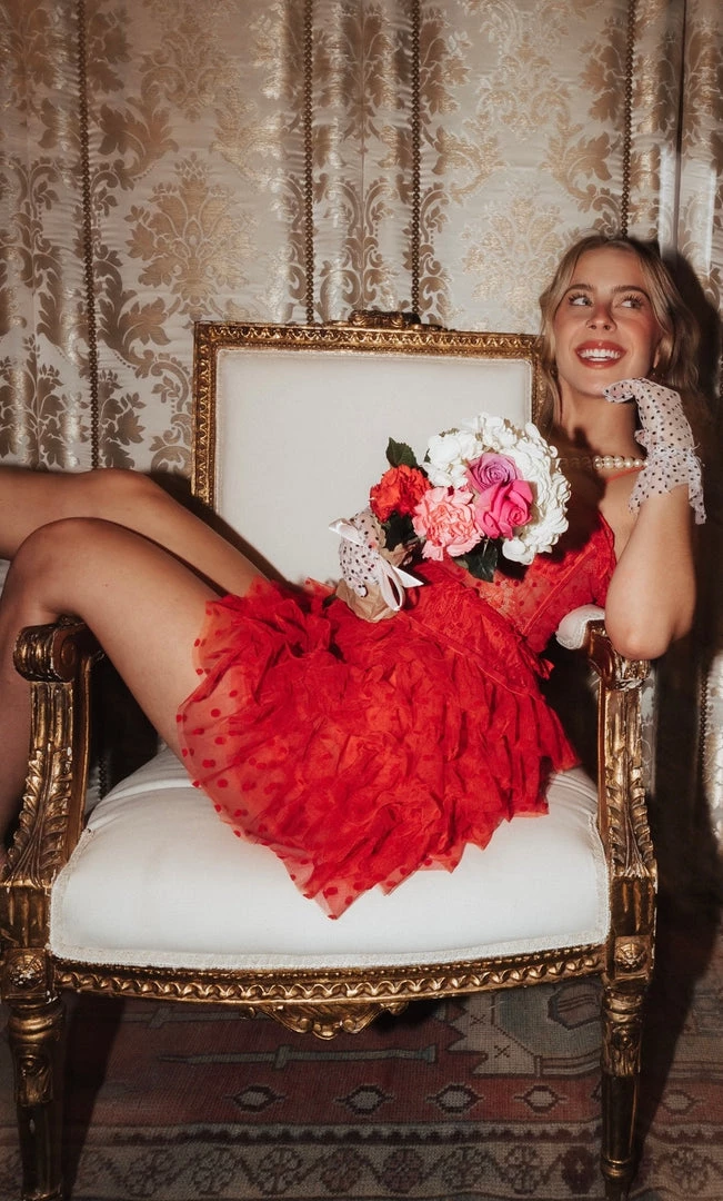 Super feminine lace mini dress featuring flocked dot ruffled tulle and a sweetheart neckline. Skirt is tutu-style with contrast velvet detailing and adjustable shoulder straps.