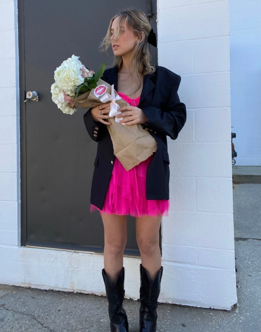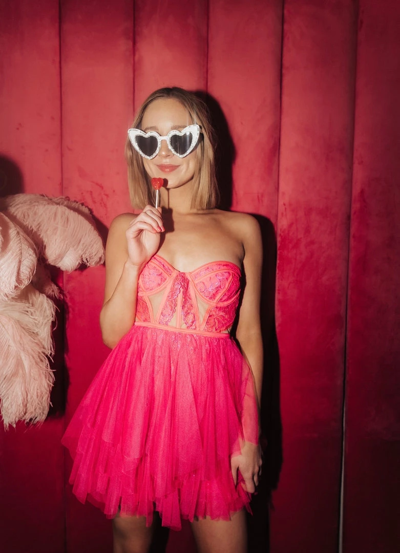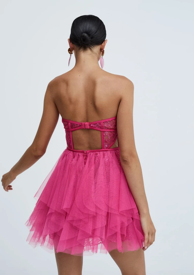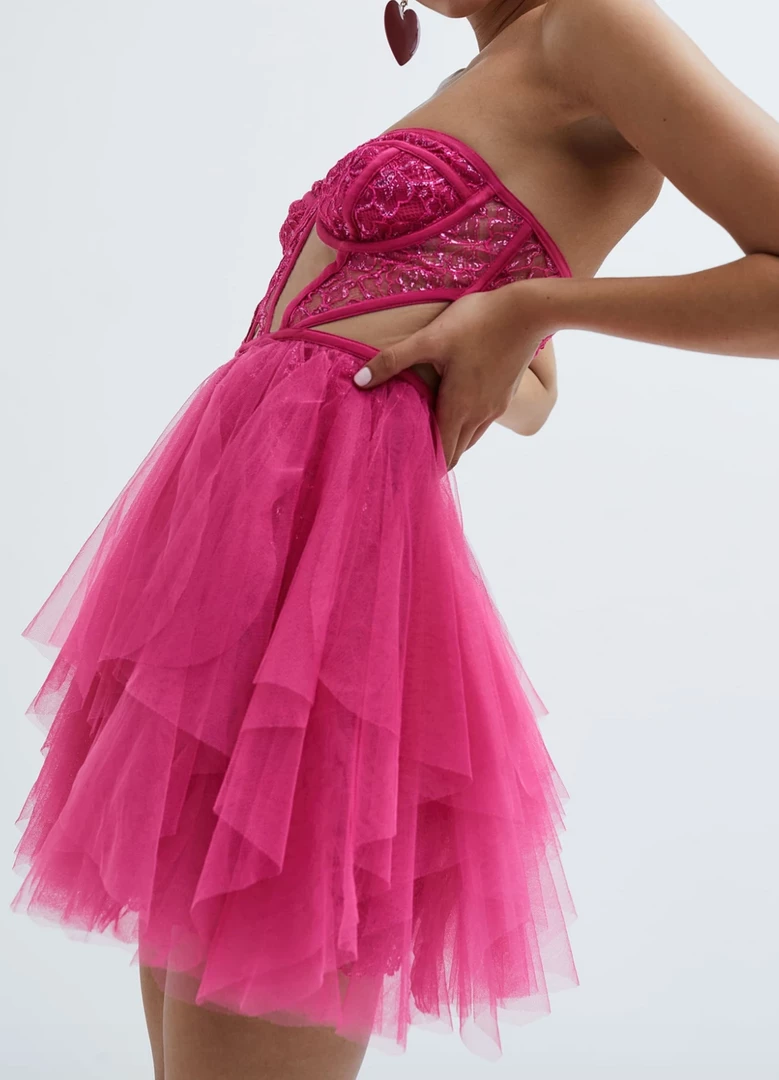 Party-ready strapless mini dress featuring a lingerie-inspired bodice with metallic lace and sheer mesh panels. Cascading mesh ruffle skirt with a visible lace mini skirt lining. Hook-and-eye closure and invisible zipper at back.