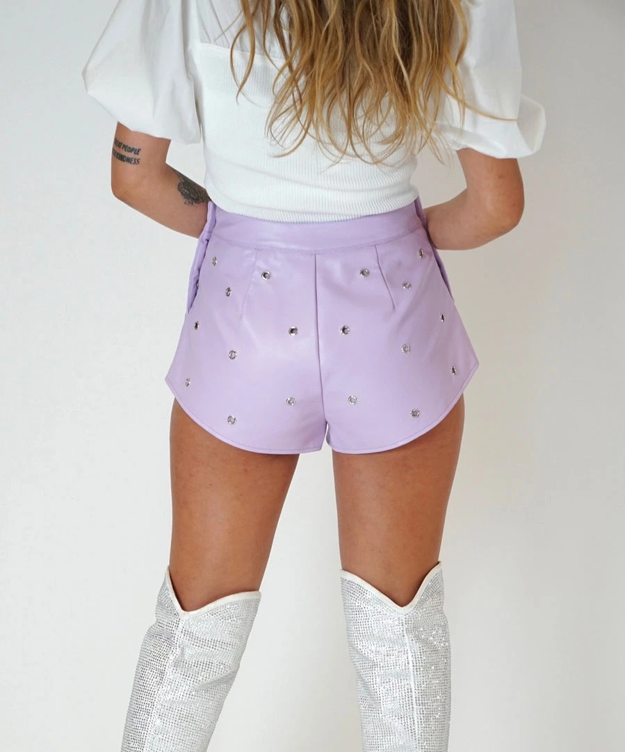 Chic faux leather shorts featuring a delicate lace-up front and allover silver grommets detailing. Silver snaps at side are functional at the waist.