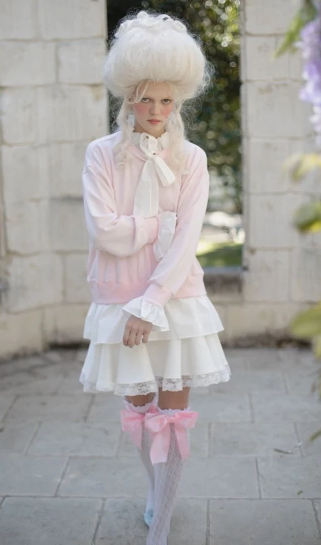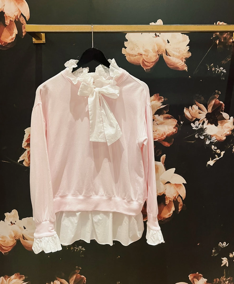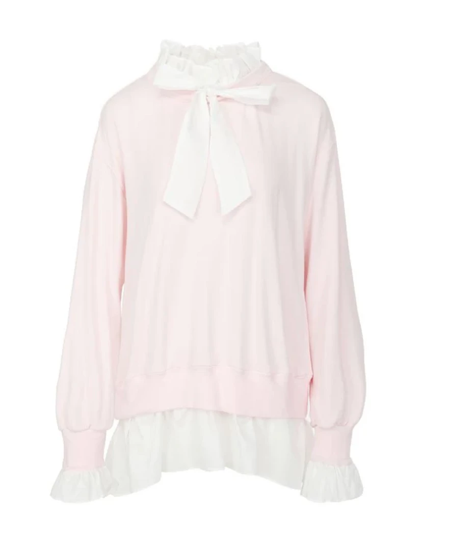 - Light pink cozy sweater lined with ruffle collar and sleeves