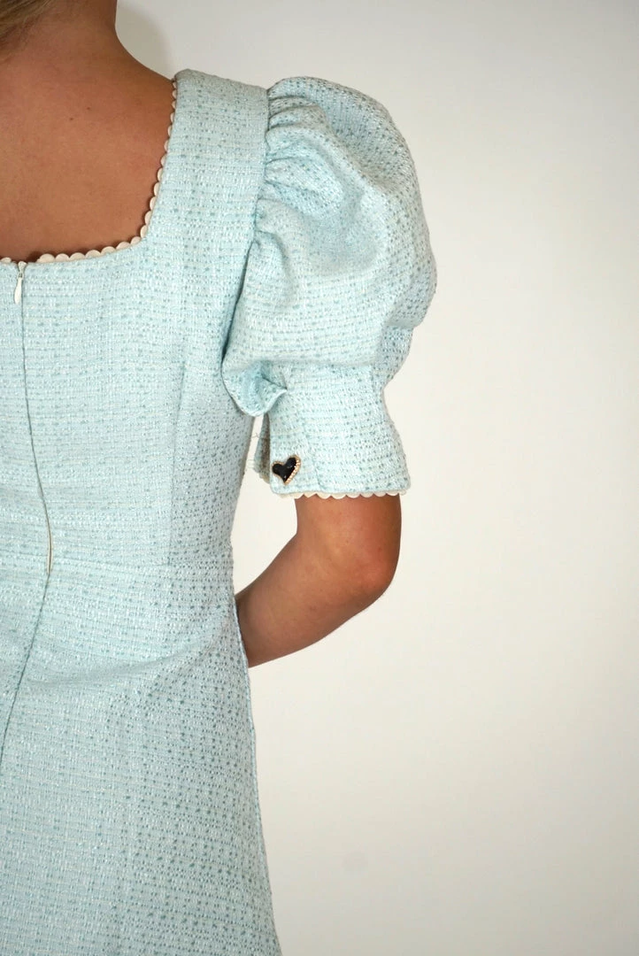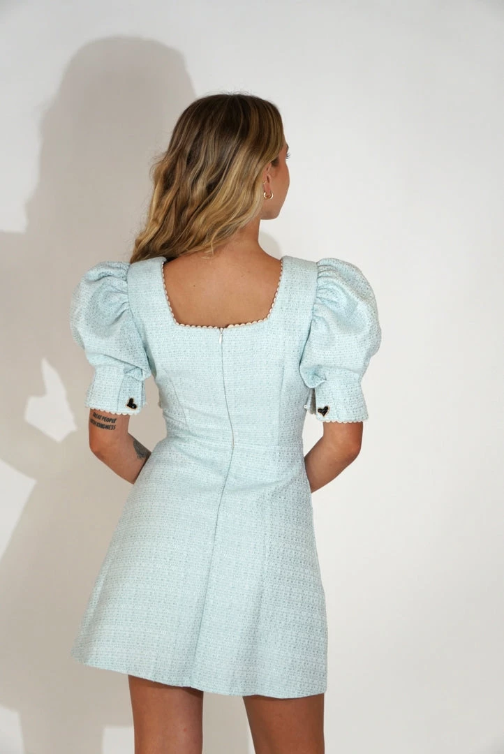 - Form-fitted tweed mini dress featuring a puff sleeve and square neckline