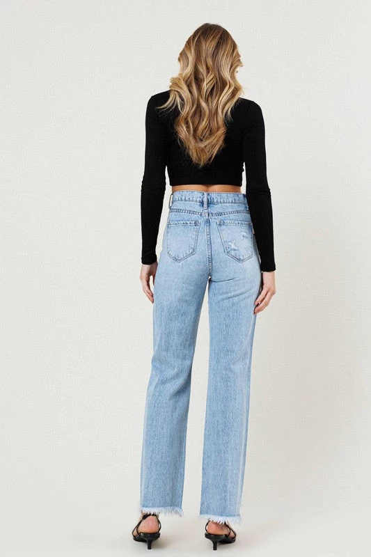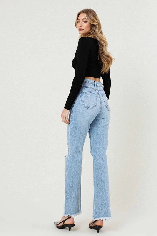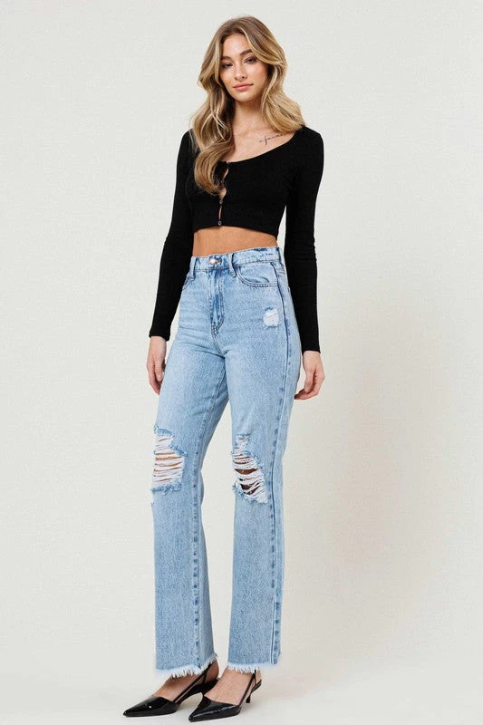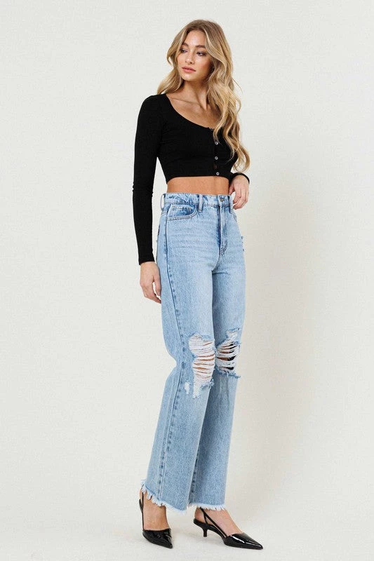 - A pair of high rise wide fit jeans featuring distressed front, classic 5 pocket construction, and a zip fly closure. Rise: 11.5″, Inseam: 30.5″ (Measurements taken from size 5) 1st model: 5’10” and wearing a size 3, 2nd model: 5’8″ and wearing a size 3 True to size